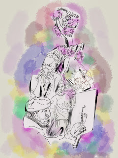 The sultan Ahmed (Blue) Mosque and the Ortaköy osque incorporating the Bosphorus suspension Bridge laid over the top. In the Ipad app Procreate I then drew outlines of the other elements. Adding the Whirling Dervish (Sufi) Skirts. I then saved as a jpeg to import to Adobe Indesign on a layout of the correct dimensions.